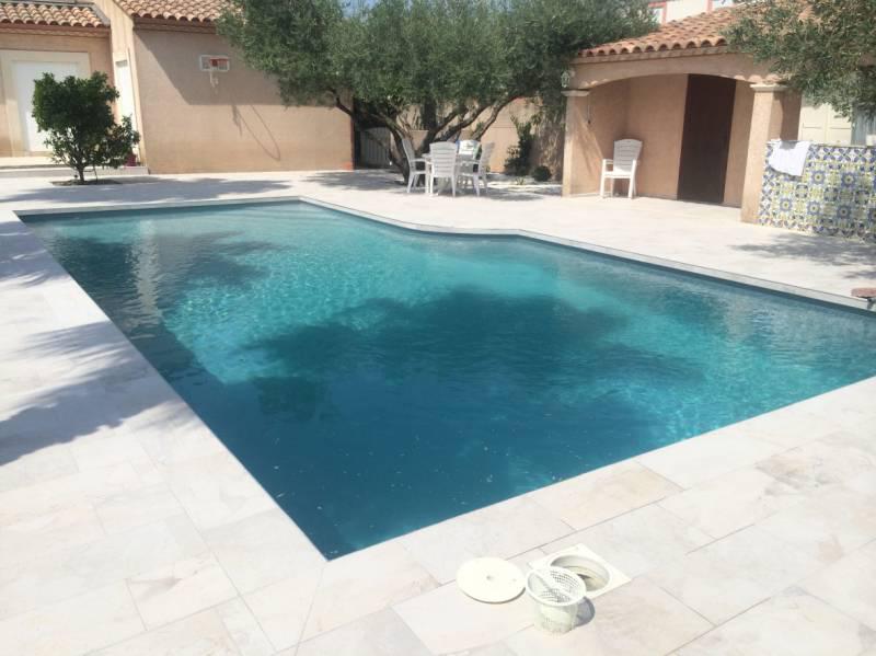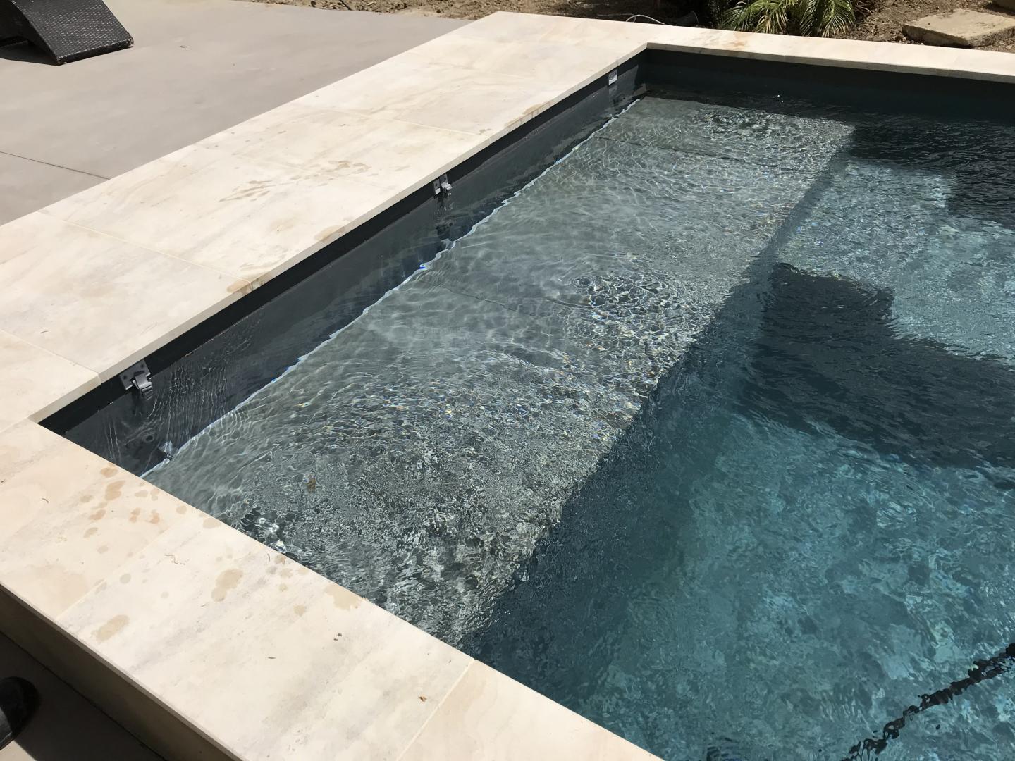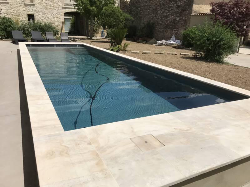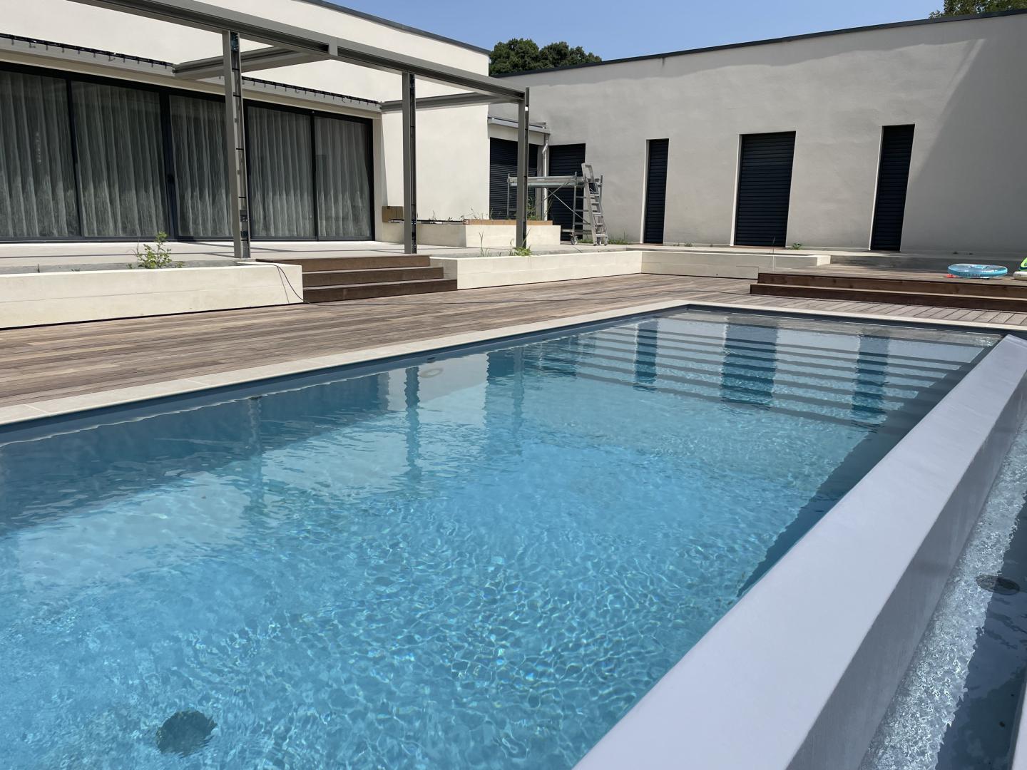 Application de polyester sur les parois de la piscine.Pose des margelles et carrelage de la plage ceinturant la piscine