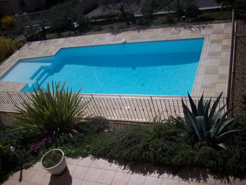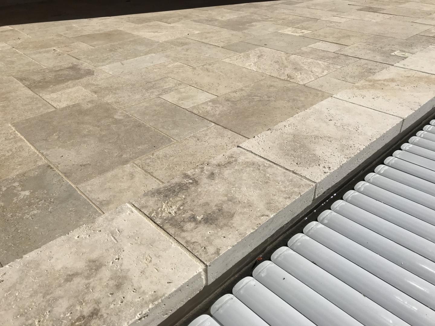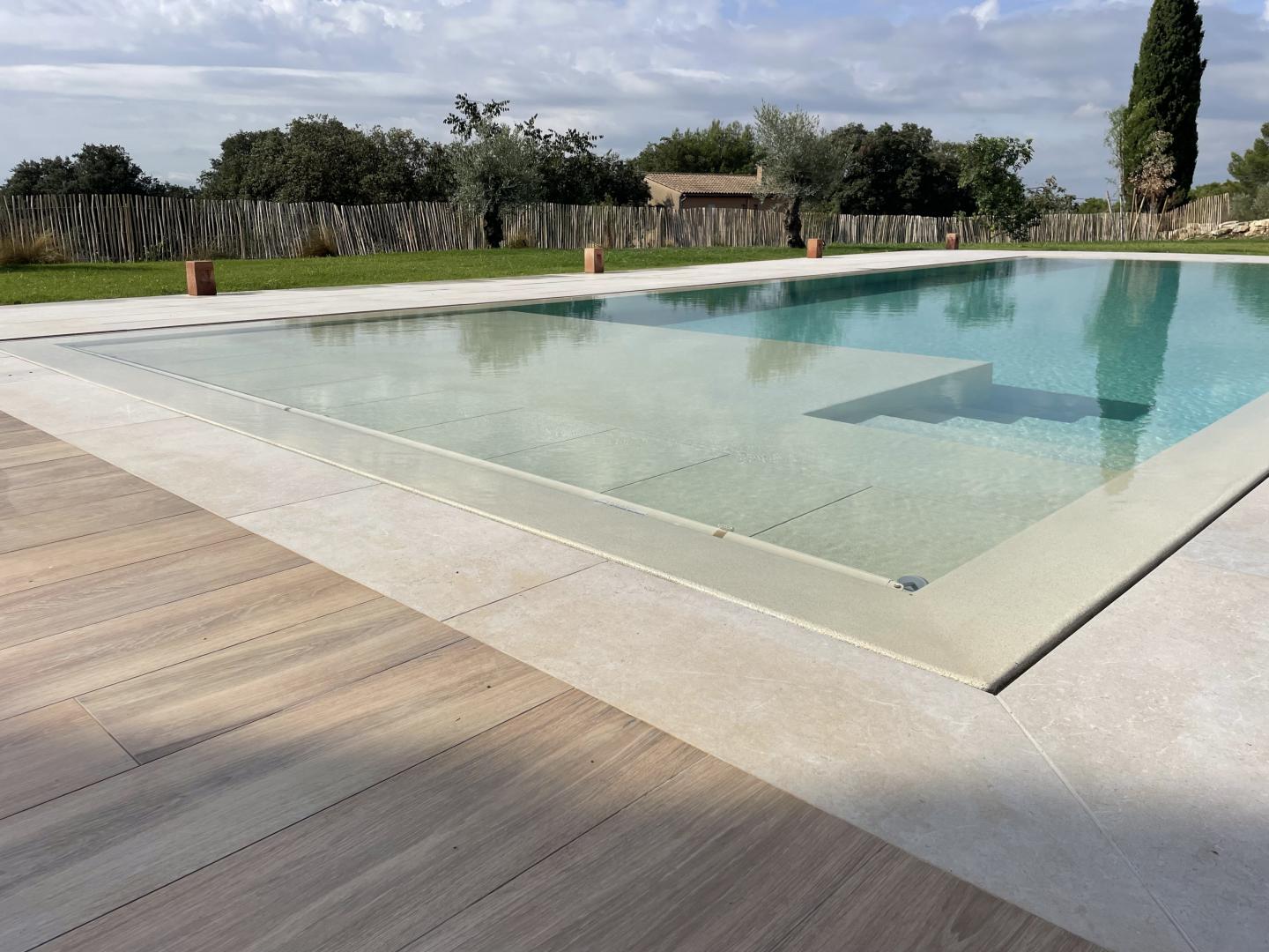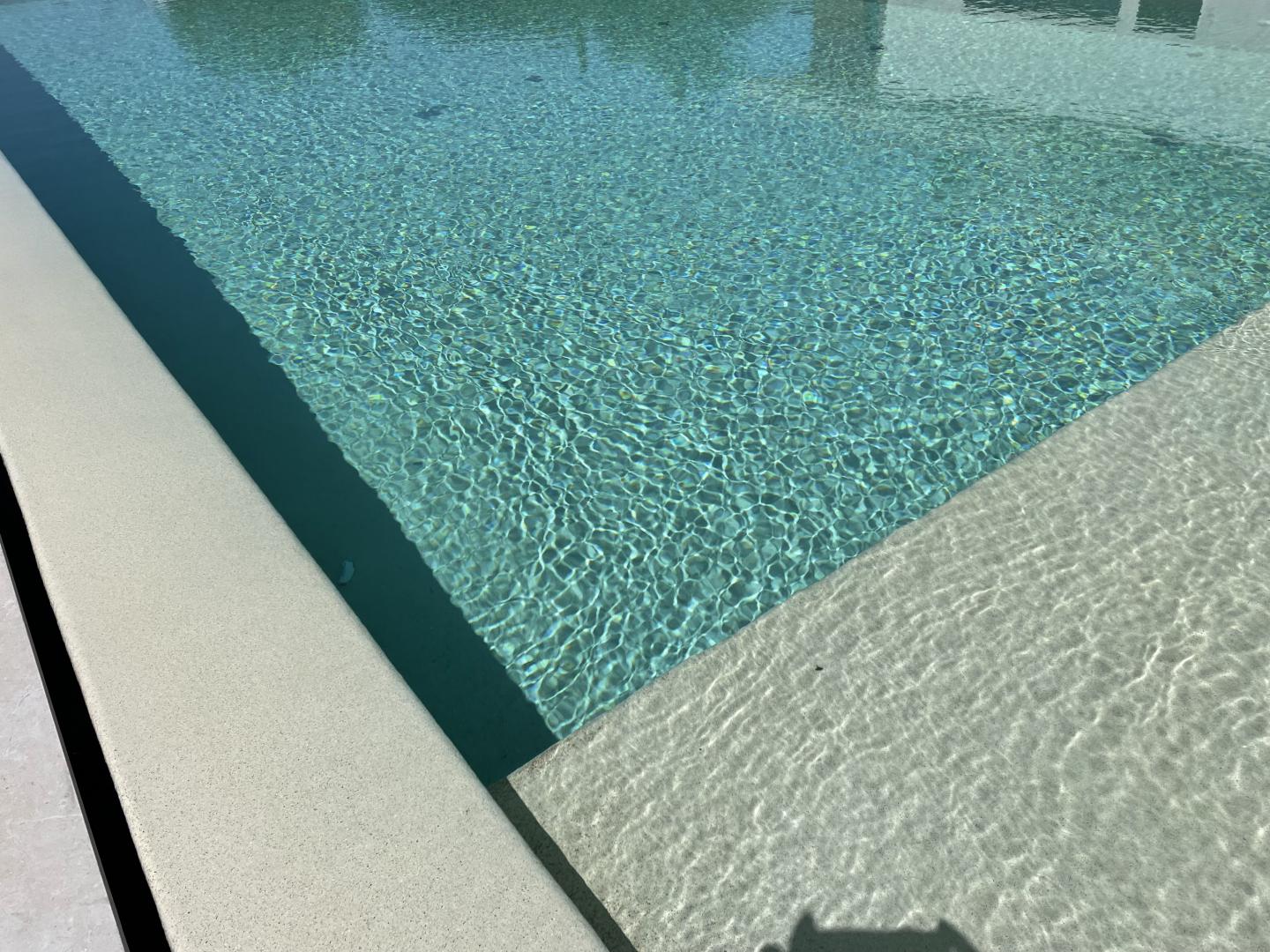 Application de polyester sur les parois de la piscine.Pose des margelles et carrelage de la plage ceinturant la piscine