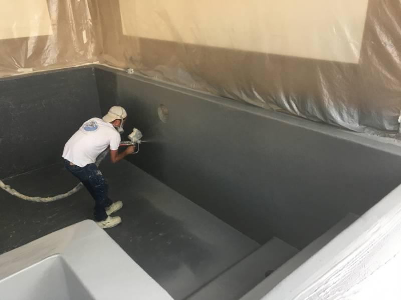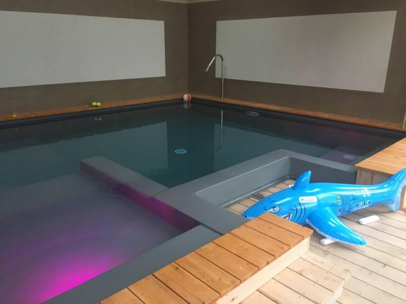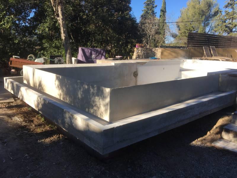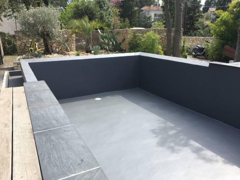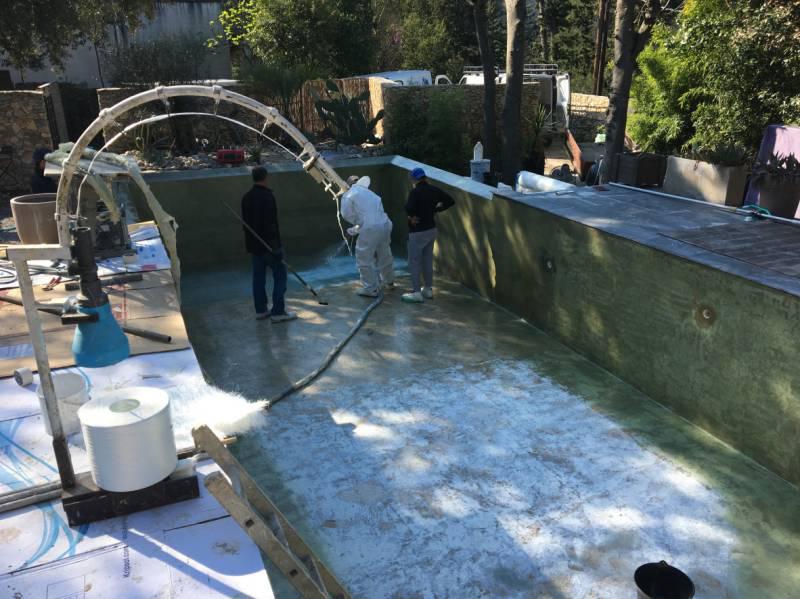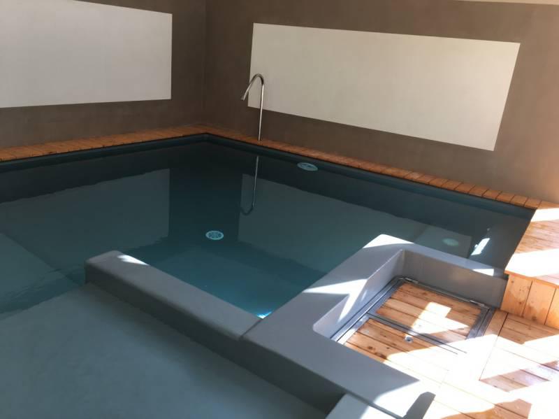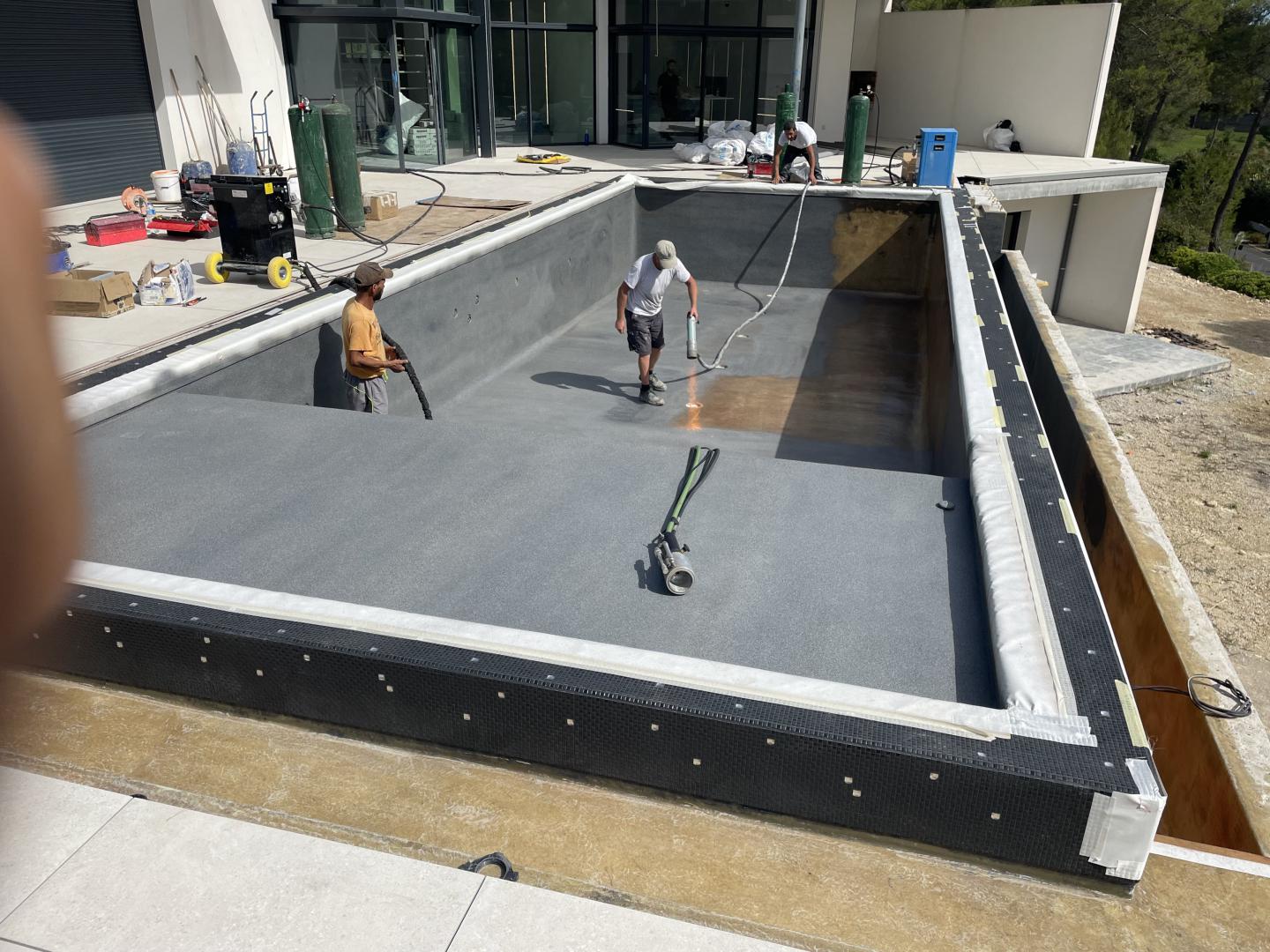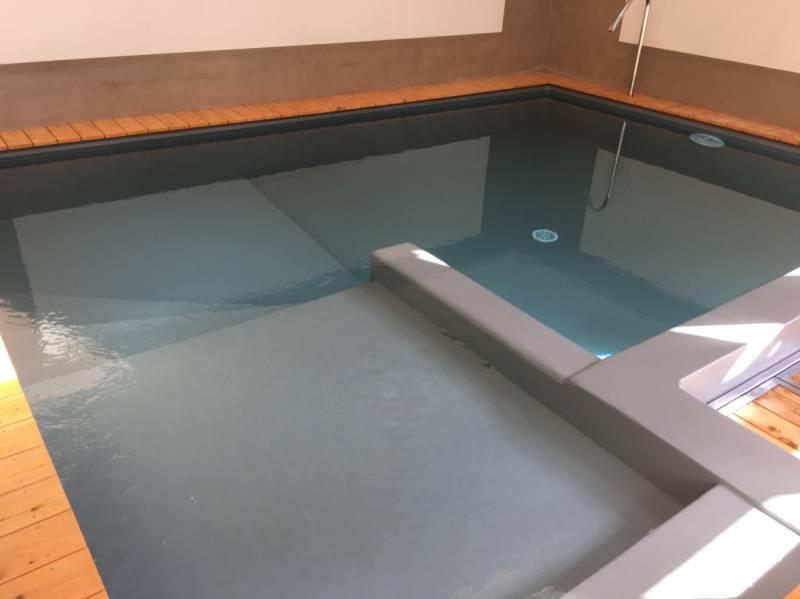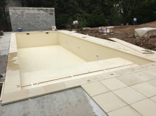 Piscine en structure banchée, piscine avec revêtement d’intérieur en polyester, sol et mur de la piscine