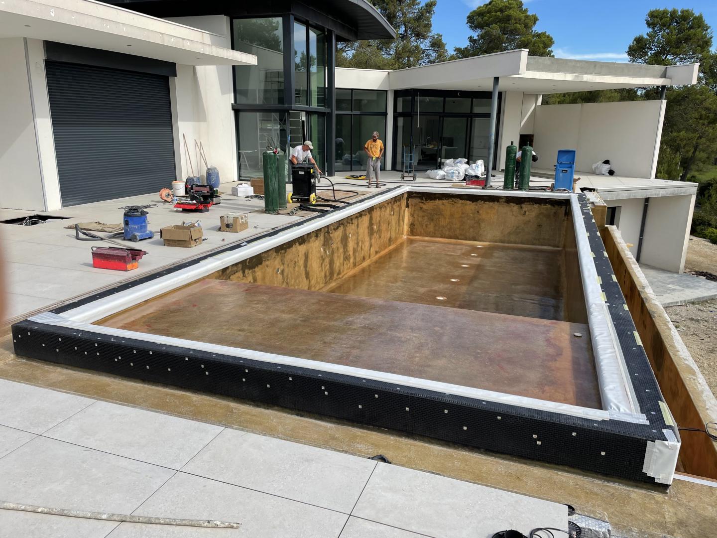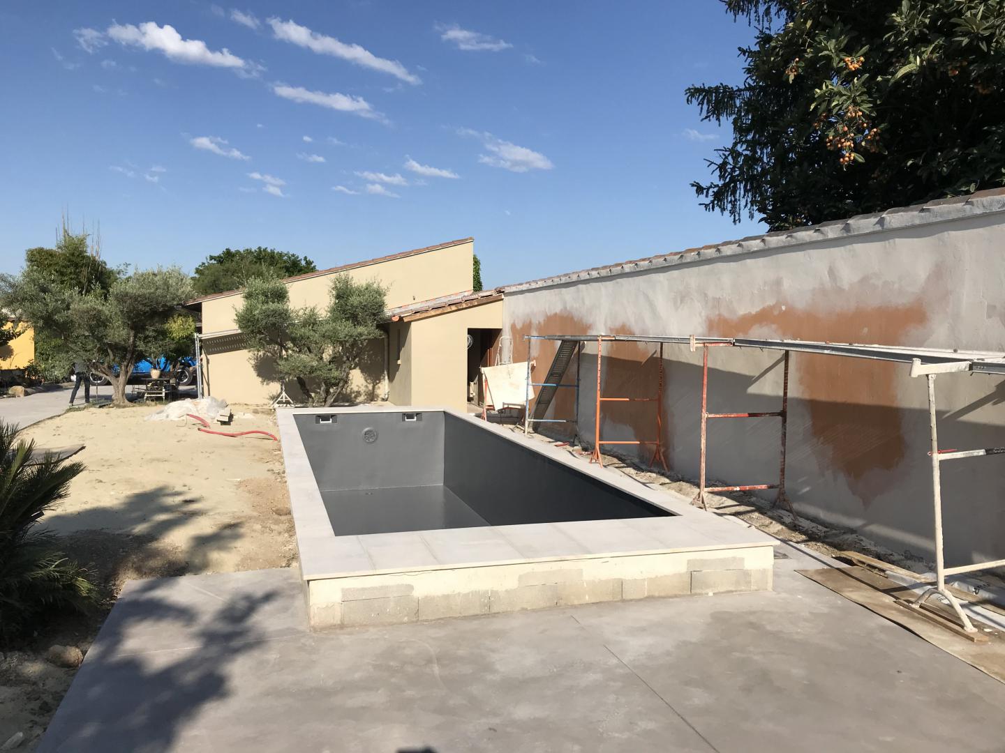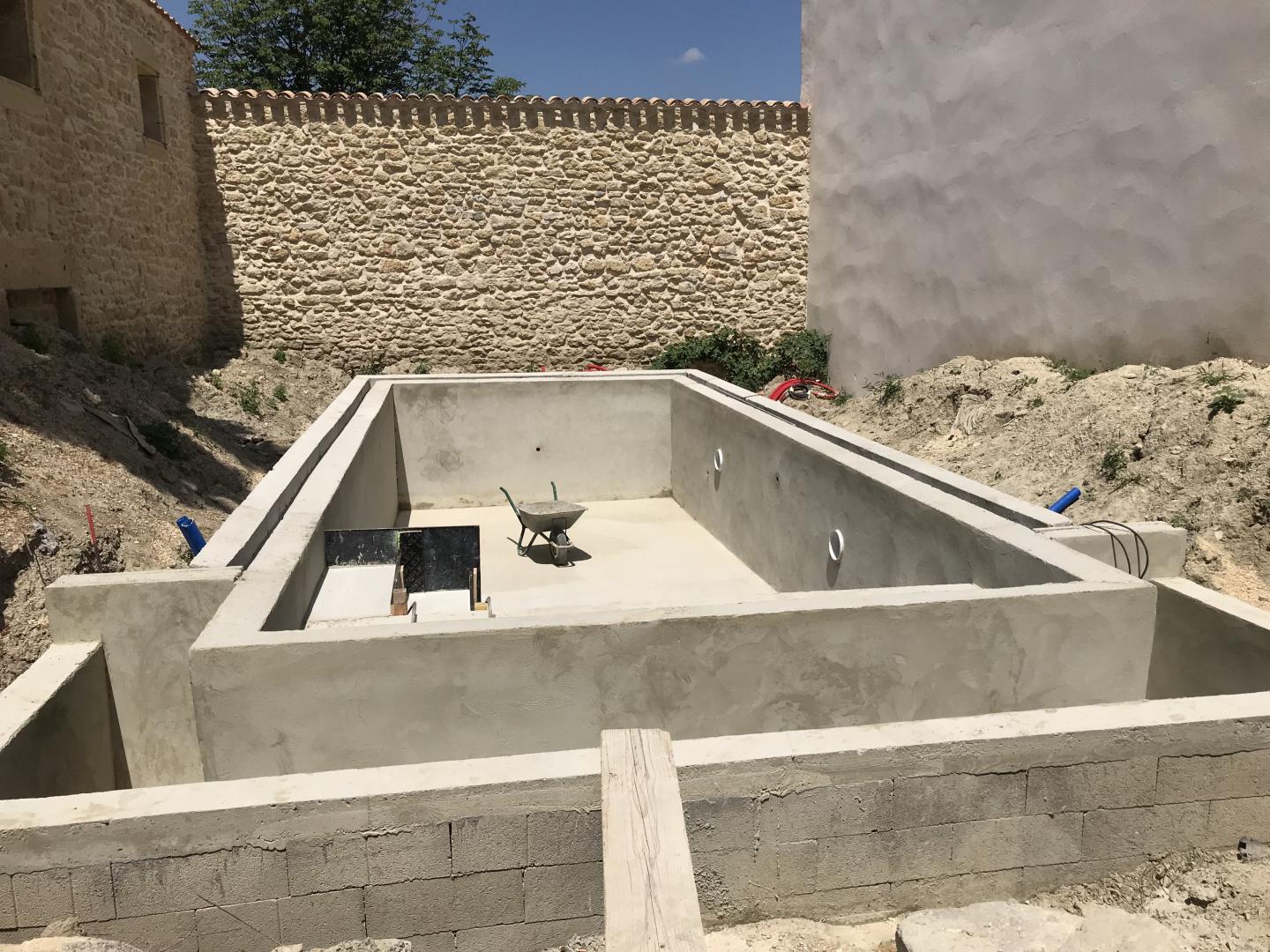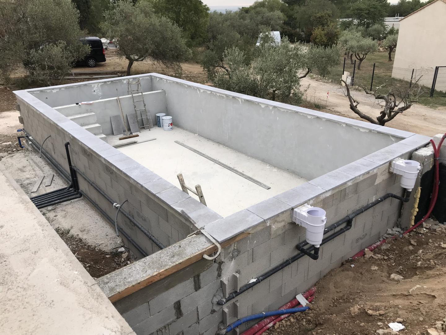 Piscine en structure banchée, piscine avec revêtement d’intérieur en polyester, sol et mur de la piscine