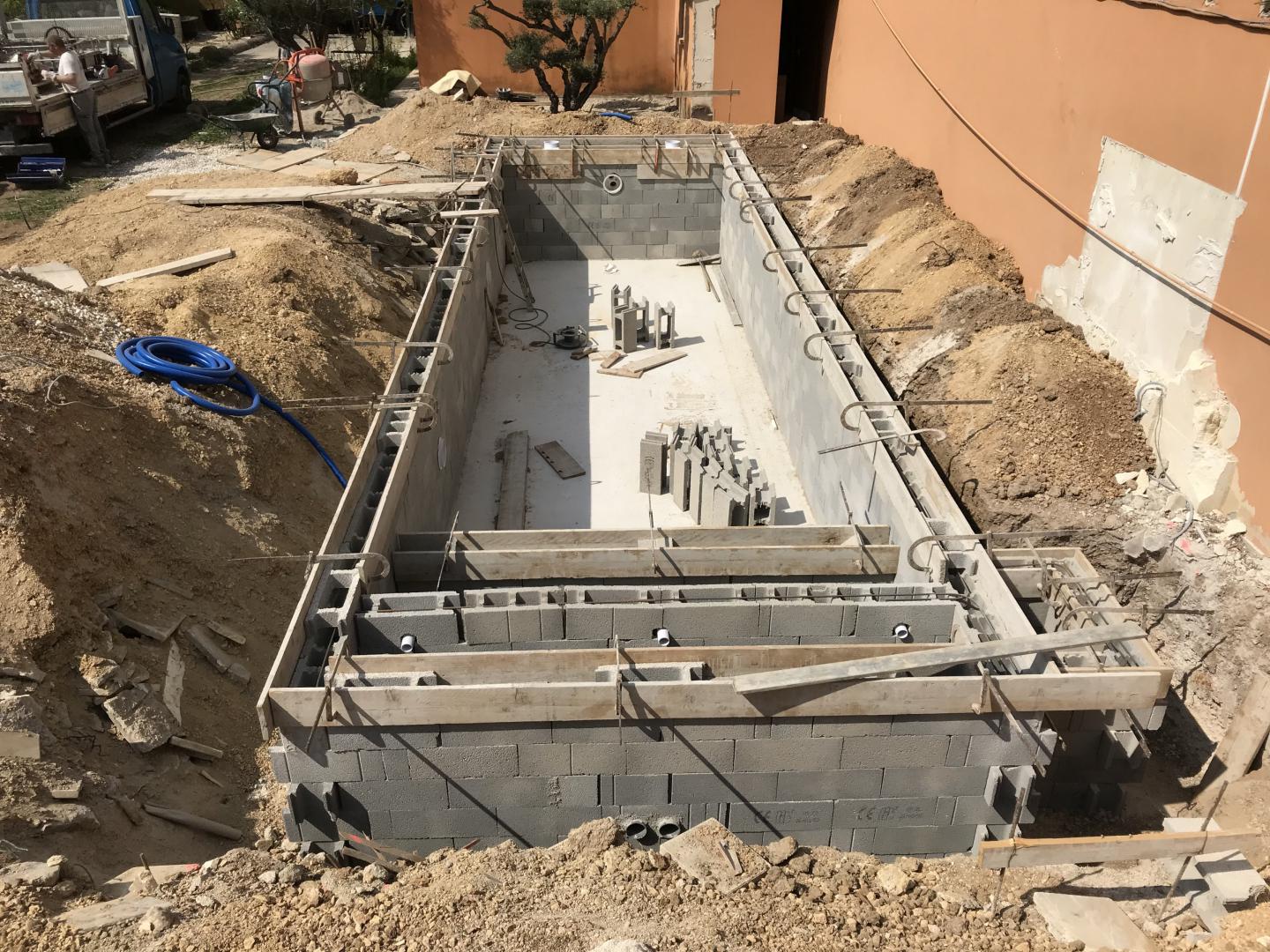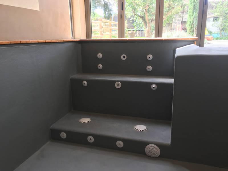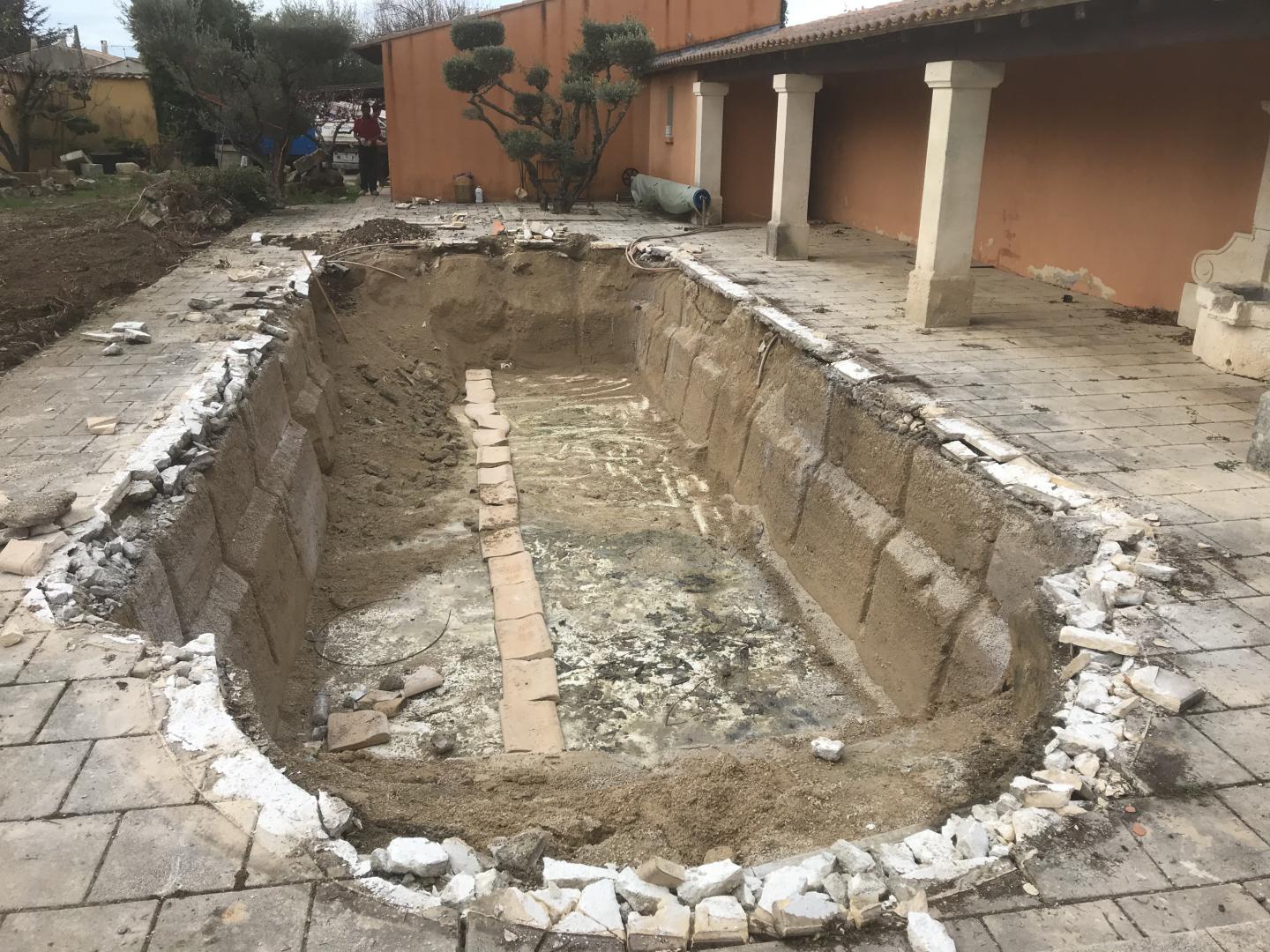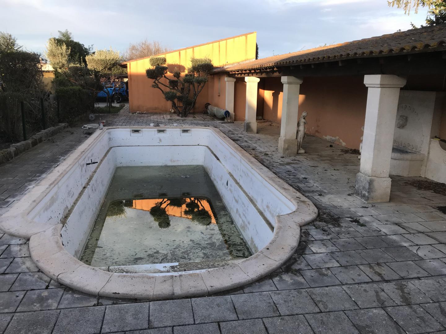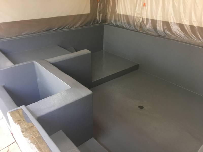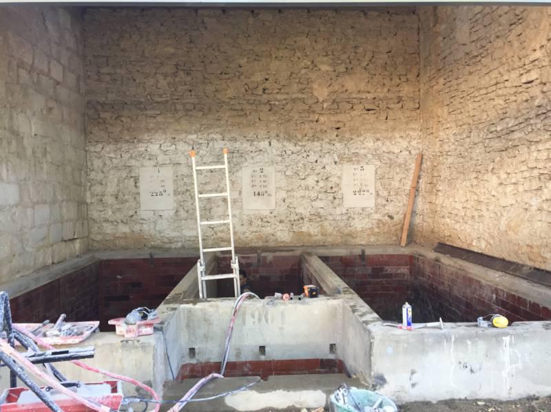 Piscine en structure banchée, piscine avec revêtement d’intérieur en polyester, sol et mur de la piscine
