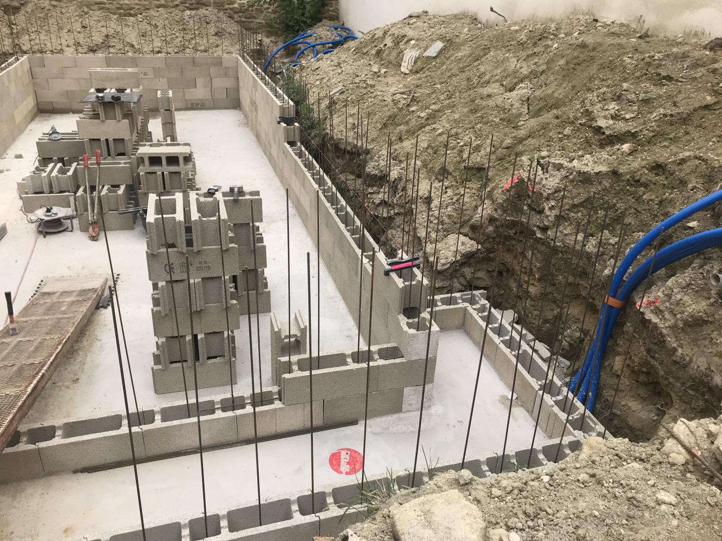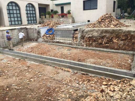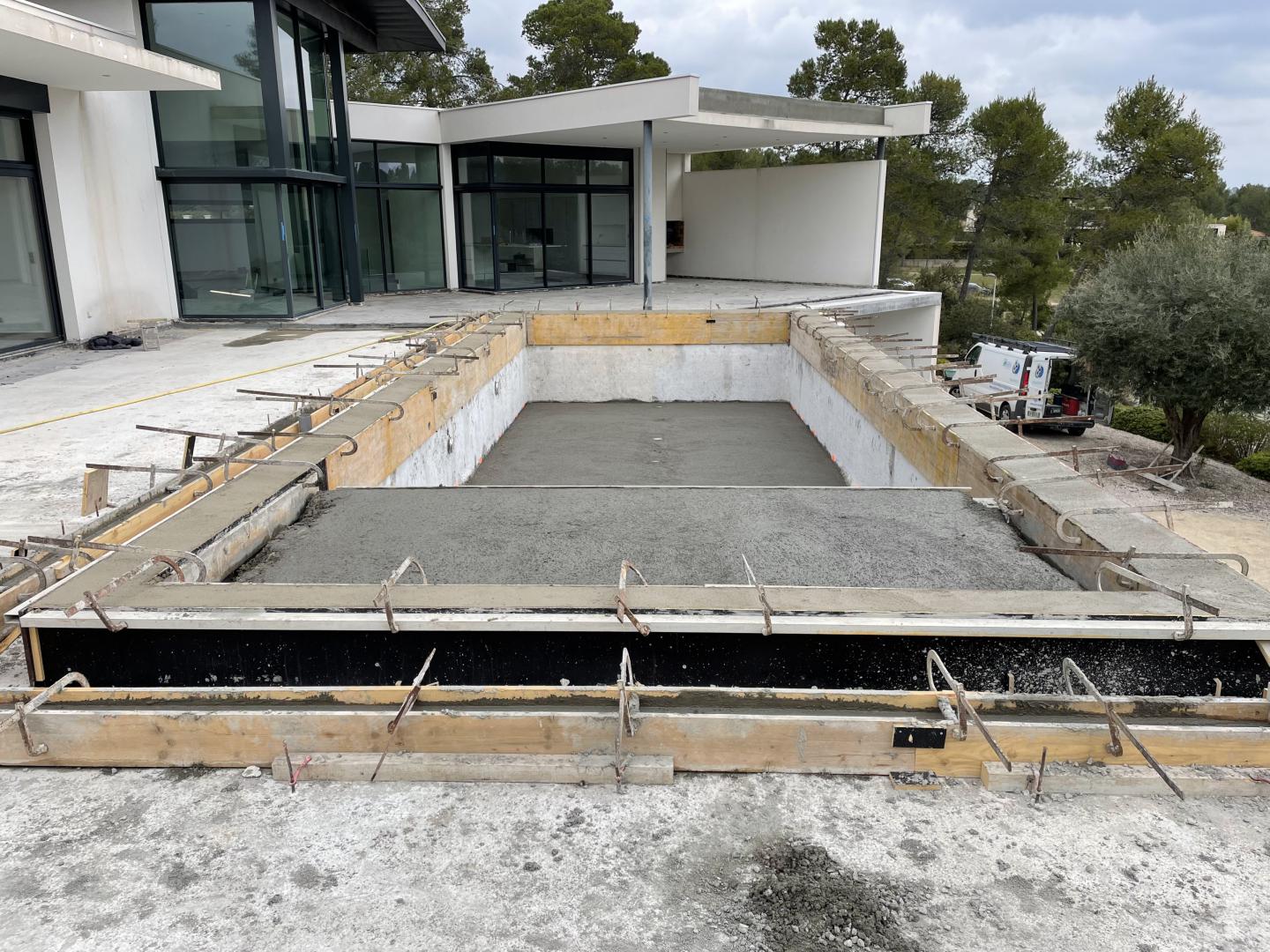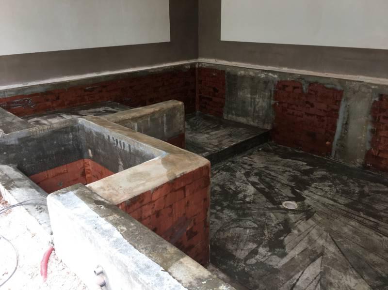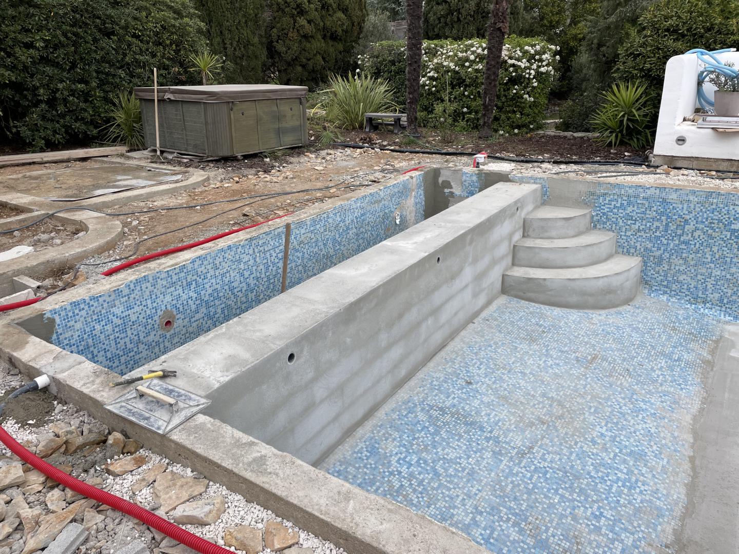 Piscine en structure banchée, piscine avec revêtement d’intérieur en polyester, sol et mur de la piscine