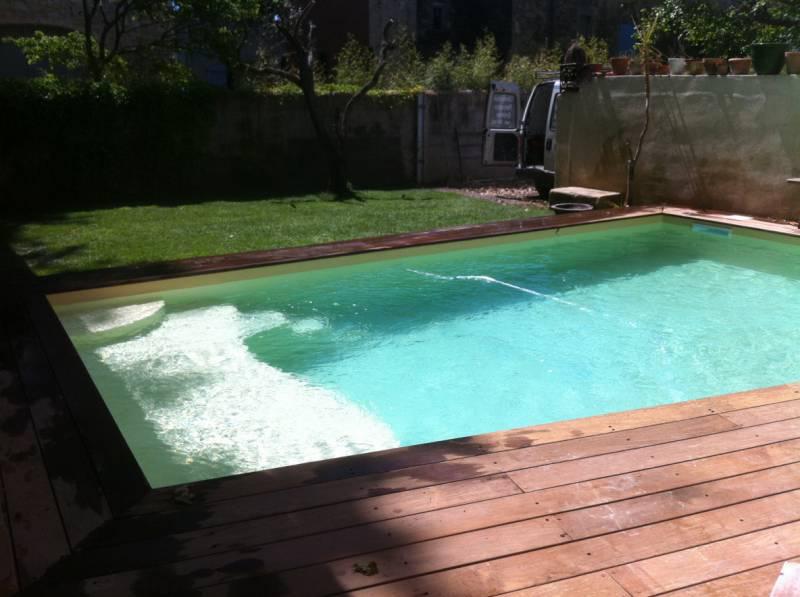 Piscine en structure banchée, piscine avec revêtement d’intérieur en polyester, sol et mur de la piscine