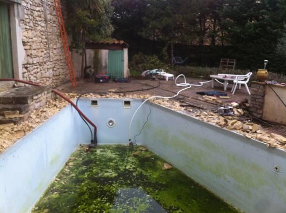 Pour réduire la profondeur de la piscine nous allons rehausser la bonde de fond, en y raccordant directement un tuyau à la verticale, dans l'attente du collage d'une pièce neuve. Nous allons déverser du gravier au fond de la piscine jusqu' à atteindre le niveau que vous aurez choisi. Pour finir nous coulons un radier avec le scellement de la nouvelle bonde de fond.
